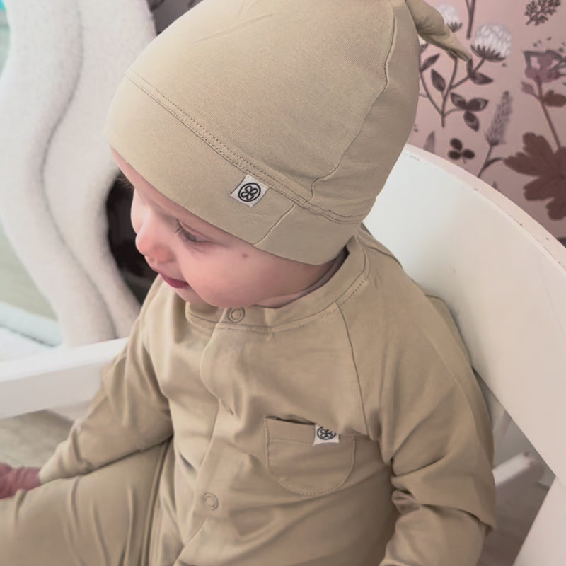 Die Beanie Knoten ist ein bequemes Alltags-Essential – drinnen wie draußen – und passt perfekt zu unseren Spielanzüge.